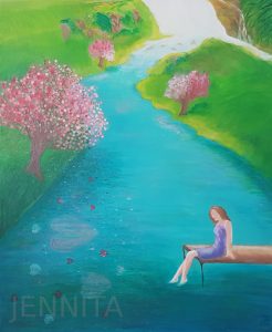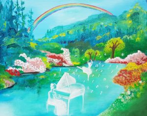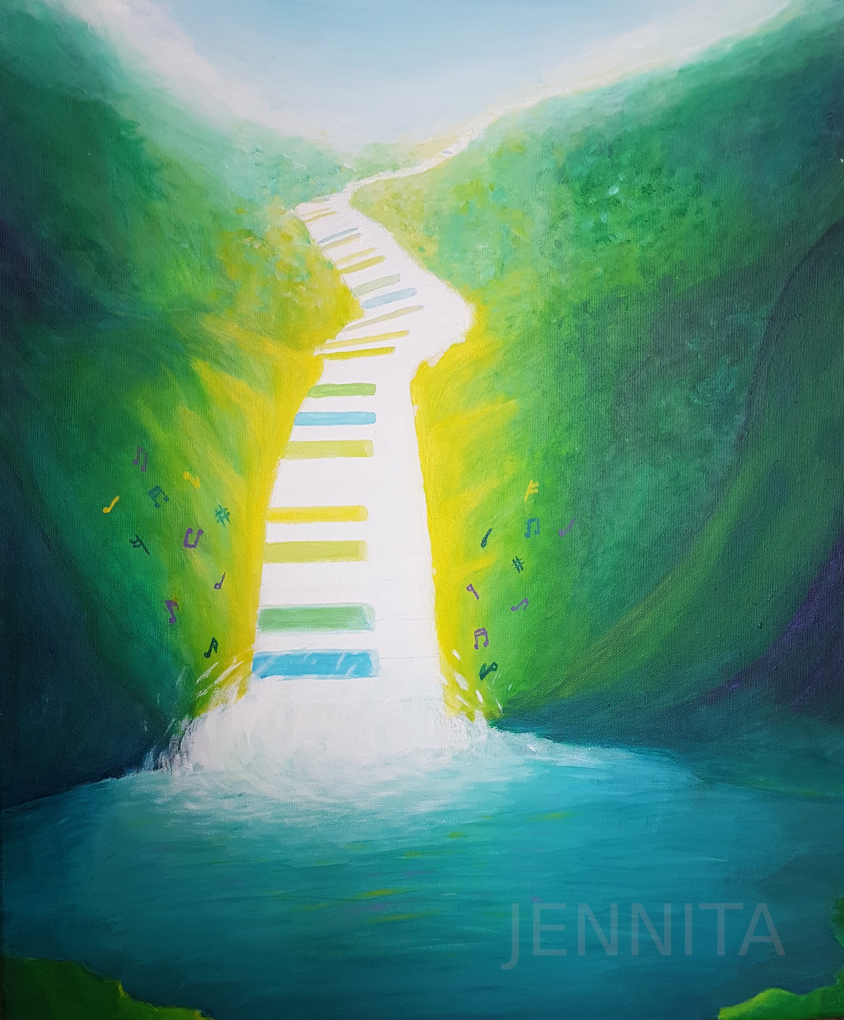 Bij dit schilderij was ik een waterval aan het schilderen en zag er toen een piano in. Het spreekt tot mij over het levende water (Heilige Geest) wat uit Gods Troon stroomt. Dit kunnen liederen en woorden zijn om andere mensen te bemoedigen.