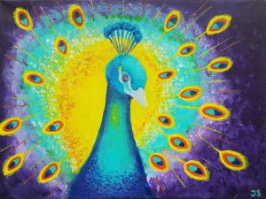 Bij dit schilderij dacht ik na over het thema uniek zijn en moest denken aan een pauw. In die zin dat een pauw in trots al zijn veren en schoonheid kan laten zien.